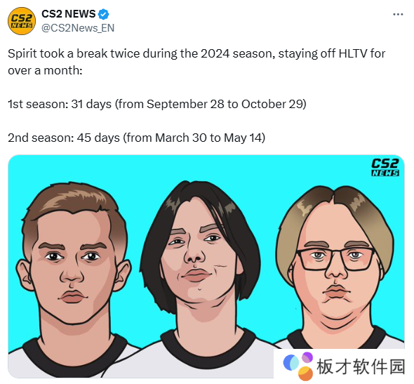 “Spirit在2024赛季中额外休息了两个休赛期,从HLTV比赛上消失了超过一个月两次: