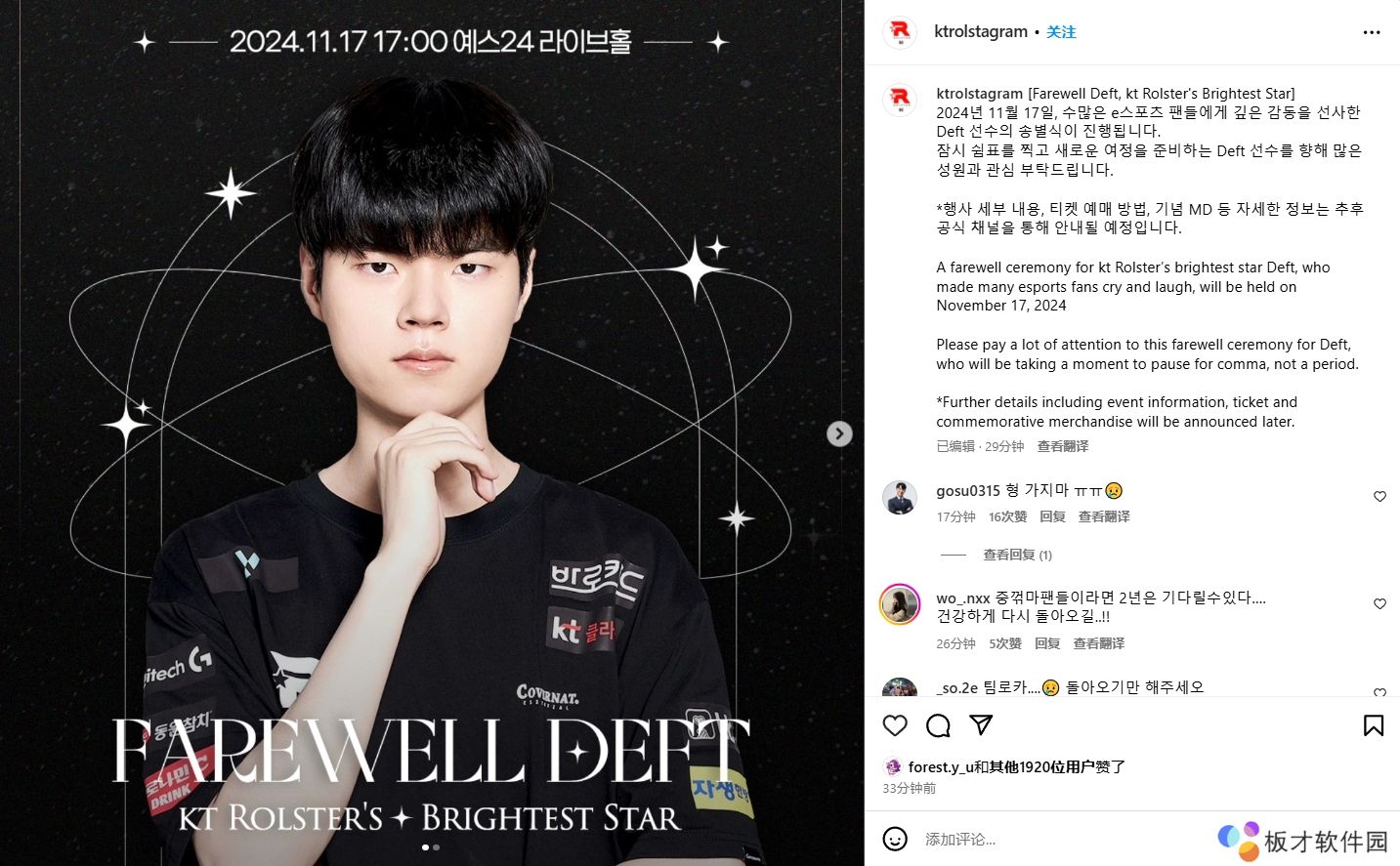 公告全文:“KT Rolster最耀眼明星Deft的告别仪式将于2024年11月17日举行,请大家多多关注 Deft 的这次告别仪式,他将会用逗号暂停片刻,而不是句号。活动信息、门票和纪念商品在内的更多细节将稍后公布。”