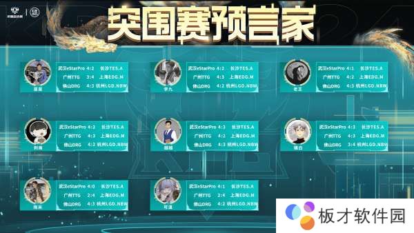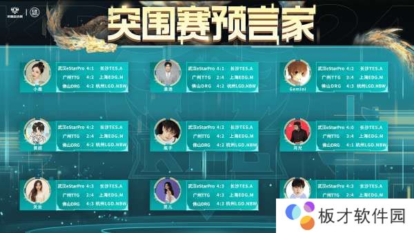 虎扑10月24日讯 嘉宾突围赛胜负预测:全员看好武汉ES,大多数看好DRG、TTG,原文如下: