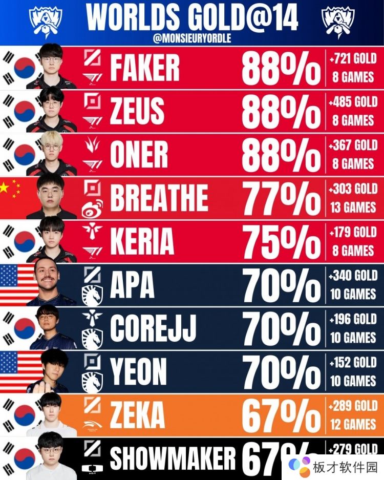 直播吧10月25日讯 外媒数据统计媒体更新,发布S14世界赛正赛阶段,选手们在对线期(14分钟内)赢线率排名。