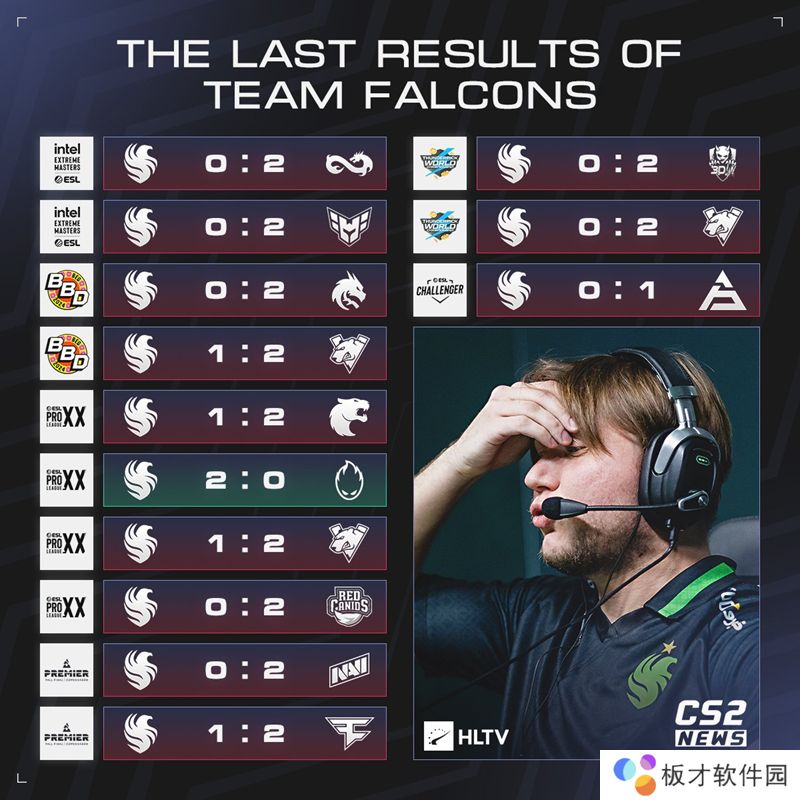 在成绩不佳的情况下,Falcons下放了SunPayus,取而代之的是传奇选手s1mple。但这并没能挽回Falcons的颓势,他们先是在TP世锦赛双败出局,又在ESL挑战者卡托维兹站首轮败北