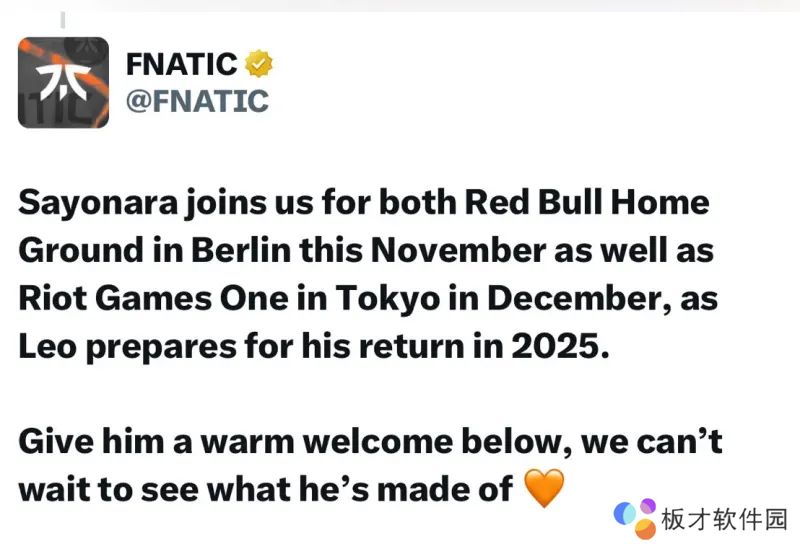 Fnatic在官方公告中补充道,Sayonara将在红牛Home Ground和Riot Games ONE中代替Leo Jannesson出战,后者自今年6月以来因健康原因一直未能参赛。Fnatic还透露,Leo正在为2025赛季的正式回归做准备。