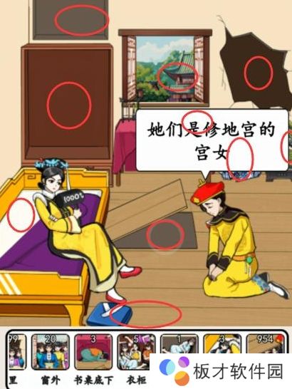 《就我眼神好》三千佳丽的通关条件为找到藏起来的佳丽,比较难找的是趴在地上的太监,需要向左滑动一下会发现是一个女的,点击古画会发现,在古画的后面也藏着一位佳丽。
