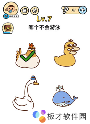 脑洞大大大第7关怎么过?第7关的题目是“哪个不会游泳”,这一关中可疑之处在于把那个长着鸭头鸡身体的动物,下面小编就为大家带来了脑洞大大大第7关攻略。