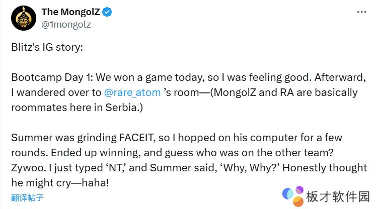 bLitz的游戏故事:训练营第一天:我们今天赢了一场比赛,所以我感觉很好。后来,我去到了RA的训练营(蒙古和RA在塞尔维亚基本上是室友。)我看到