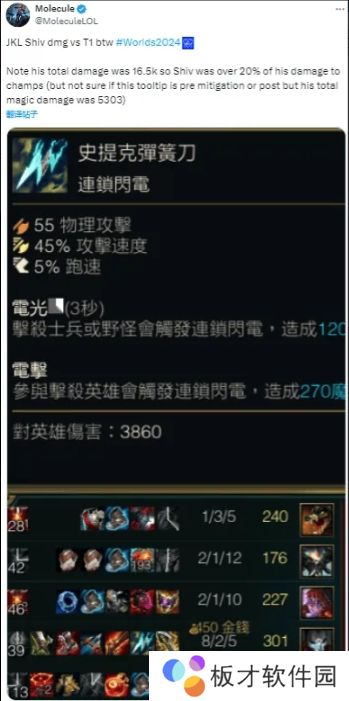 直播吧10月4日讯 S14瑞士轮TES击败T1,赛后解说Molecule发文:JackeyLove在对阵T1的比赛里使用了烬,其中值得注意的是他一共打出了16.5k的伤害(16489),单单电刀打出的伤害就有3860,这一数据在他打出的总伤害里占比超过了20%(23.4%)