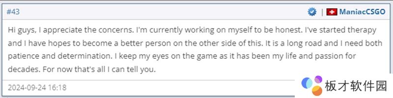 “老实说,我目前正在努力改变自己。我已经开始接受治疗,我希望通过治疗成为一个更好的人。这一过程非常漫长,我需要耐心和决心。我一直关注着CS,因为它是我几十年来的生命和激情所在。目前我只能和你们分享这么多。