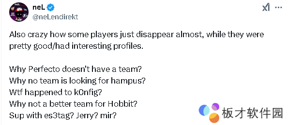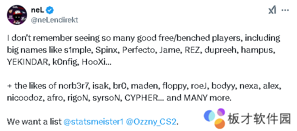 “我不记得什么时候见过这么多优秀的自由或是替补选手了,包括像s1mple、Spinx、Perfecto、Jame、REZ、dupreeh、hampus、YEKINDAR、k0nfig、HooXi等大牌选手……以及n0rb3r7、isak、br0、Maden、floppy、roeJ、bodyy、nexa、alex、nicoodoz、afro、rigoN、syrsoN、CYPHER......以及更多其他优秀的选手。我们需要一份名单。”