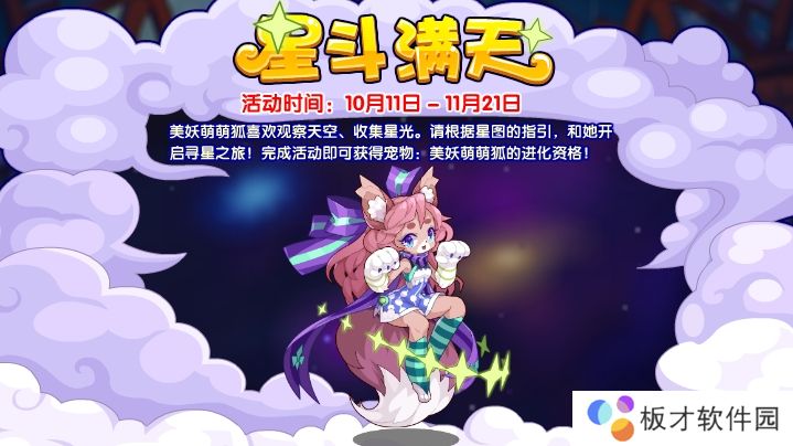 美妖萌萌狐喜欢观察天空、收集星光。请根据星图的指引,和她开启寻星之旅!完成活动即可获得宠物:美妖萌萌狐的进化资格!