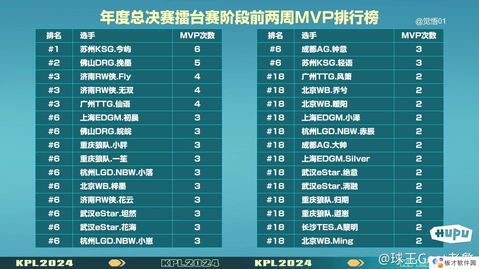 年总上两周MVP次数排行:今屿、挽墨、Fly前三