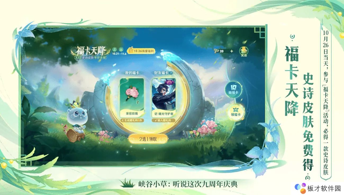 同样是10月26日这天登录游戏,只要参与“福卡天降”获得,就必定会获得一款史诗皮肤,在官方爆料的信息中,有铠的曙光守护者哦,加上九周年庆的新皮肤桑启鸣野蒿,时光种子自选1款的2-8周年庆皮肤,一共可以白嫖3款皮肤。