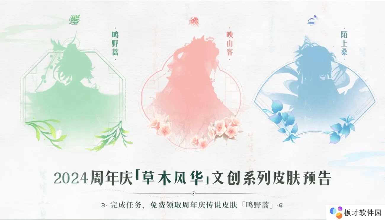 九周年的皮肤主题是草木风华文创系列,皮肤的数量从1款上升到3款,这3款皮肤分别是桑启的鸣野蒿,艾琳的陌上桑,王昭君的映山客,其中鸣野蒿的等级是限定传说,且只要参加周年庆活动就能免费获得。