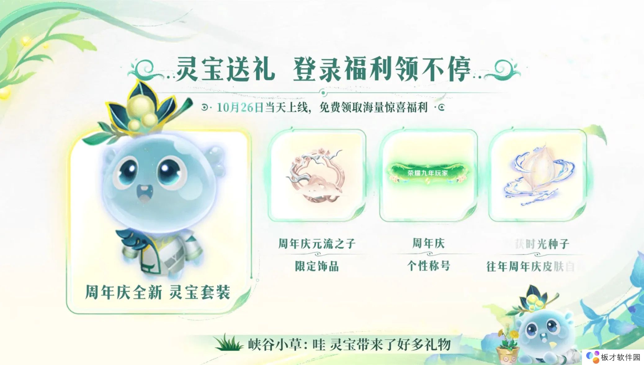 10月26日当天登录游戏除了可以领取周年庆全新的灵宝套装外,还能领取周年庆元流之子的限定饰品,周年庆个性称号,以及采摘成熟的时光种子,可以白嫖一款周年庆限定皮肤,2-8周年主题皮肤任选一款,如果都有了则可以获得其他奖励。