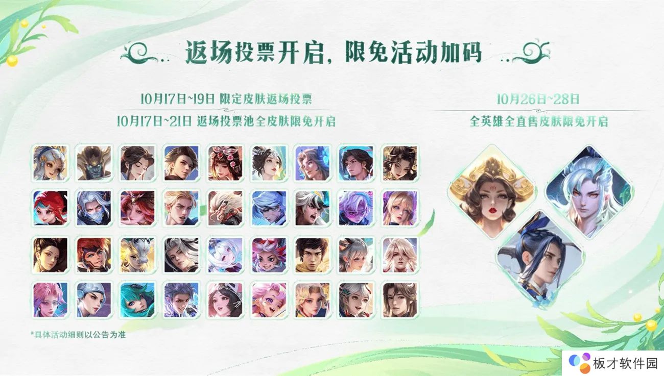 另外10月17日-21日,返场投票池中的限定皮肤都将限时免费使用,10月26日-28日则是全英雄和全直售皮肤限时免费。