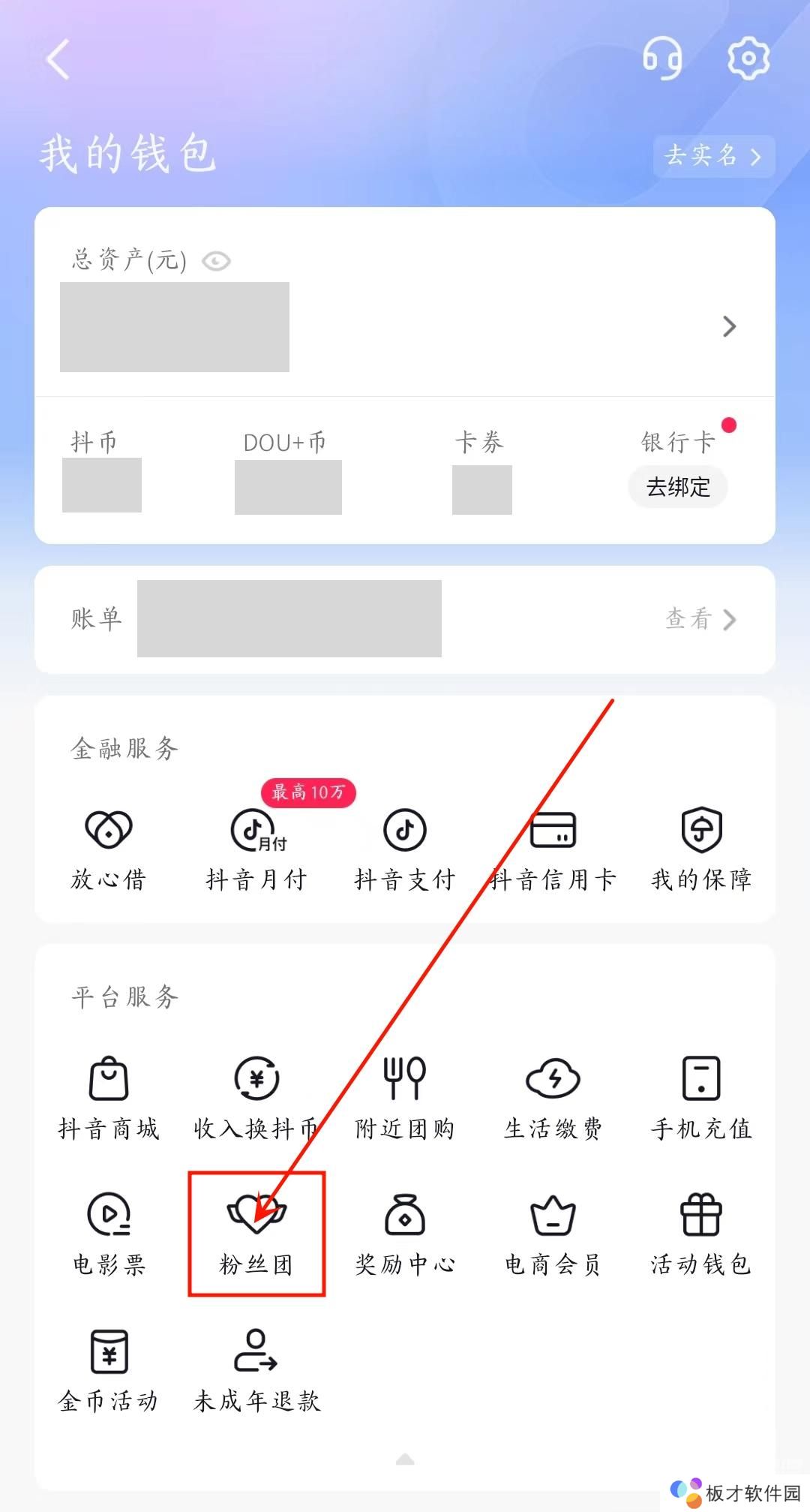 2、在我的钱包页面,点击“粉丝团”。
