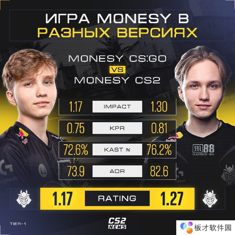 据外媒数据统计,去年CSGO时期m0NESY打出1.17 rating、0.75 KPR和73.9 ADR数据,而到了CS新版本发布后,所有数据都有明显提升,打出1.30 rating、0.81 KPR和82.6 ADR。