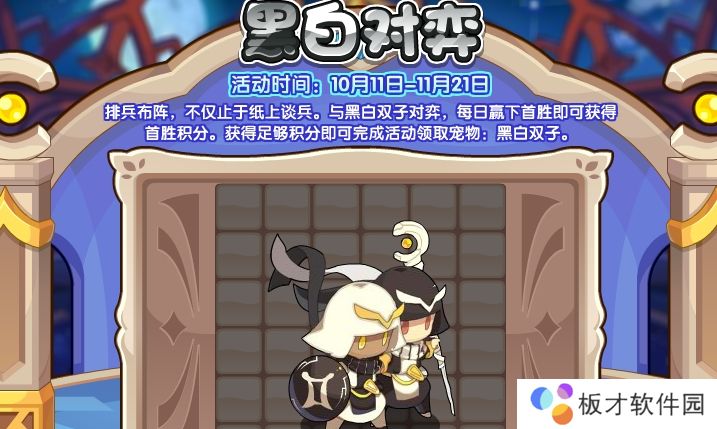 排兵布阵,不仅止于纸上谈兵。与黑白双子对弈,每日赢下首胜即可获得首胜积分。获得足够积分即可完成活动领取宠物:黑白双子。