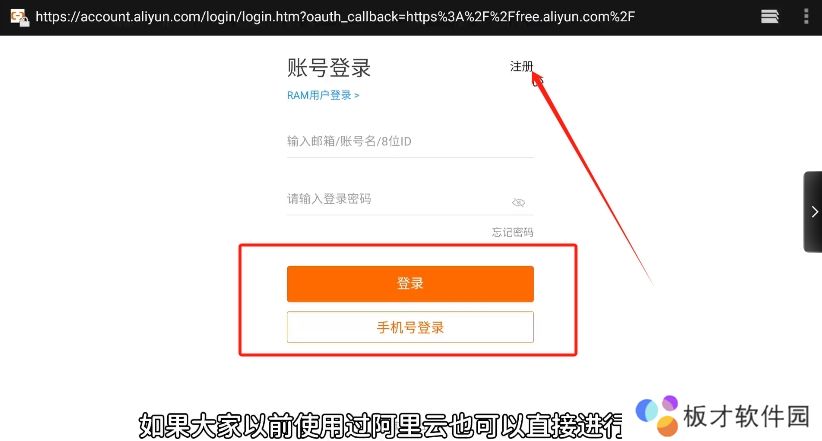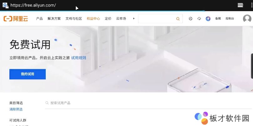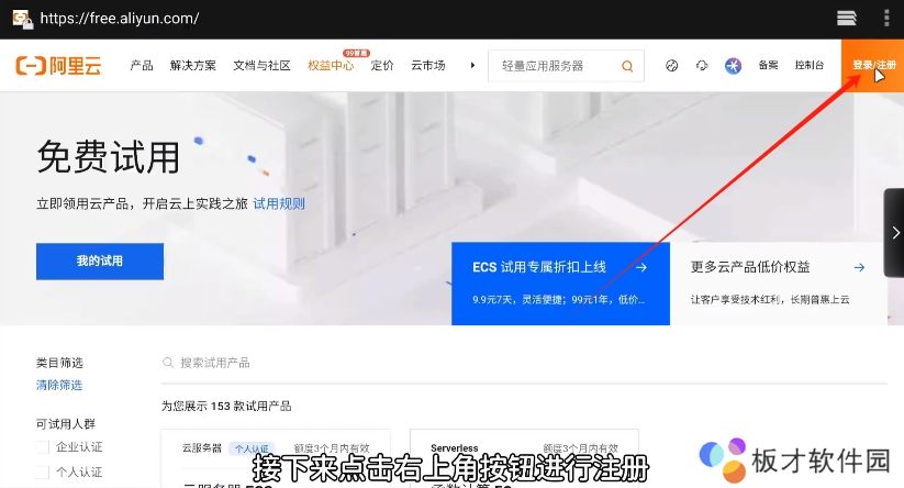 2、接下来点击右上角按钮进行注册,如果大家以前使用过阿里云,也可以直接进行登录。登录完毕后回到这个界面,然后往下翻找。
