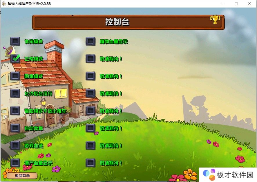2、点击选项-勾选全屏,游戏难度模式可以在右下方位置进入控制台,包括僵尸血量显示、植物血量显示、自动收集、游戏加速、不送小推车等等功能。