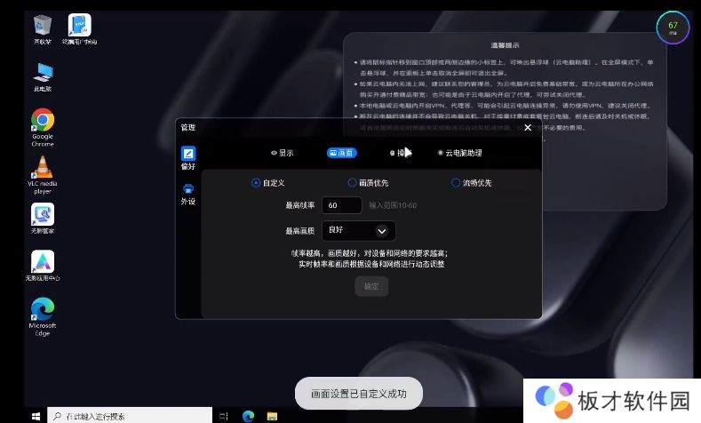11、上面的悬浮窗是云电脑的基本菜单,可根据喜好自行调整缩放比例与分辨率。