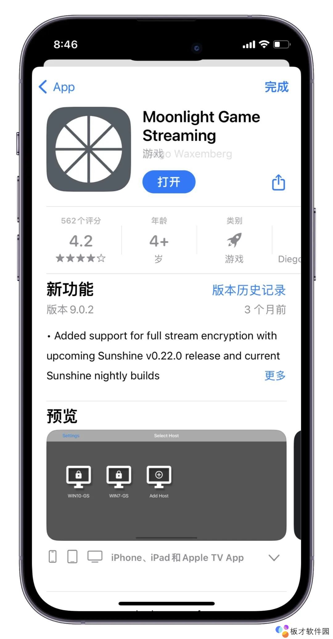 1、首先下载Moonlight Game Streaming:这个是我们需要在iOS上面安装的应用,它可以将Windows电脑画面传输到其他操作系统的客户端软件上,最高支持4K,支持键盘鼠标、手柄、触摸屏、触控笔,无广告,完全免费。通过Moonlight我们可以实现在手机上运行主机、 远程同屏追剧、单机双人游戏,更不用说植物大战僵尸了,英雄联盟、永劫无间、剑侠情缘也能玩。