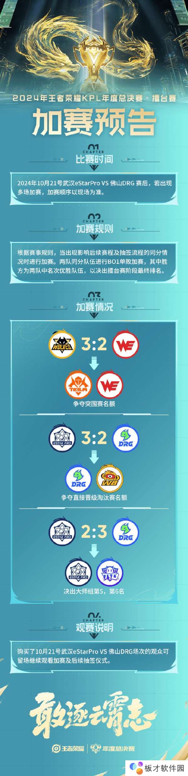 比赛时间:2024年10月21号武汉eStarPro VS 佛山DRG赛后,若出现多场加赛,加赛顺序以现场为准。