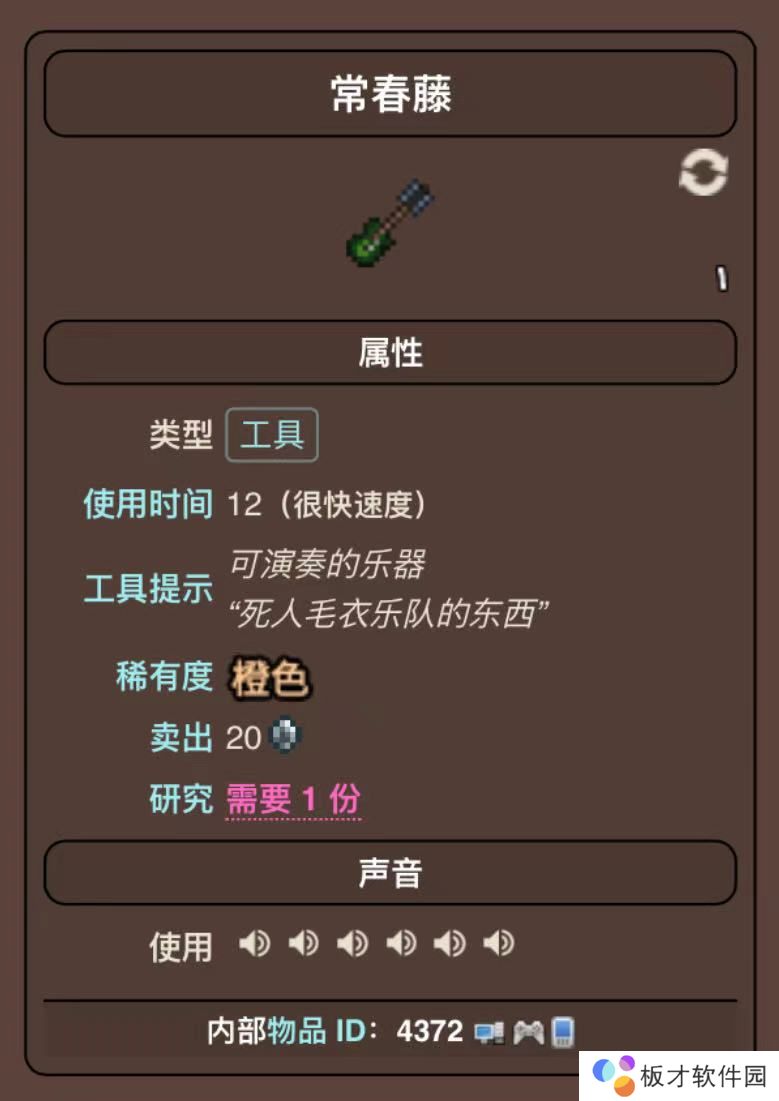 泰拉瑞亚游戏中的乐器也不多,只有八种,分别是:常青藤、雨歌、星星吉他、铃铛、鼓组、竖琴、魔法竖琴以及吉他斧,不包含八音盒在内,听说以后的版本还会更新其他的乐器。