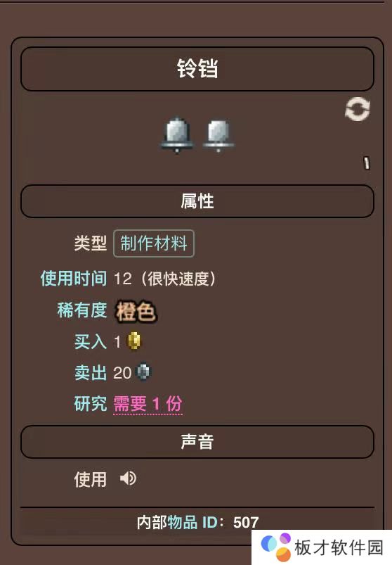 铃铛是困难模式制作材料,以1金币购买自巫师,它用于制作照明宠物召唤物品仙灵铃铛,使用时,铃铛会根据玩家和所点击的点之间的距离而改变音调。
