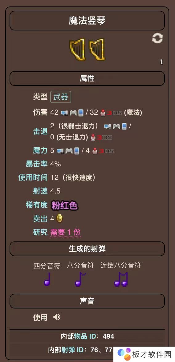 魔法竖琴是一把困难模式的魔法武器,能自动发射图形类似于紫色音符的会反弹的穿透性射弹。