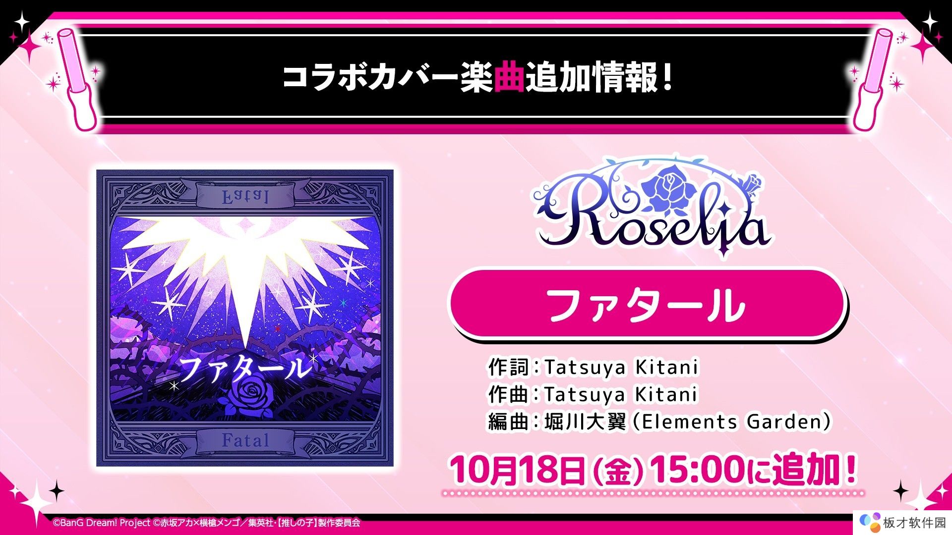 为纪念本次合作的举办,游戏内决定追加由 Roselia 翻唱的乐曲「ファタール」,可于日本时间 10 月 18 日(五)15:00 后游玩。