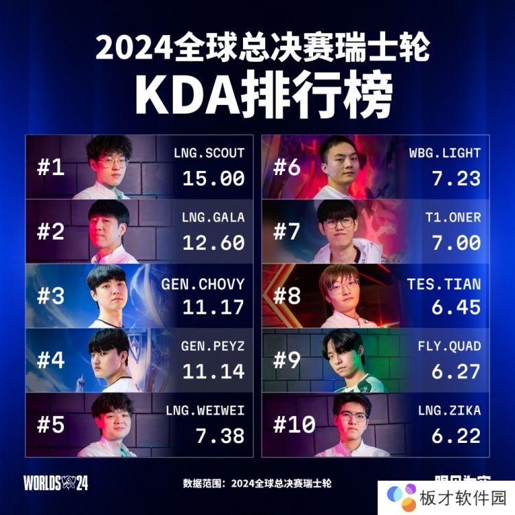 直播吧10月15日讯 英雄联盟赛事数据官博更新,发布2024全球总决赛瑞士轮KDA排行榜,Scout、GALA包揽前二。