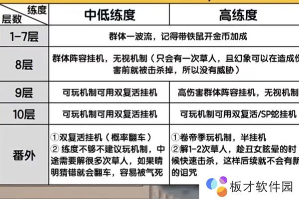 2、下图是秘闻副本不同层数和不同练度的通关思路。