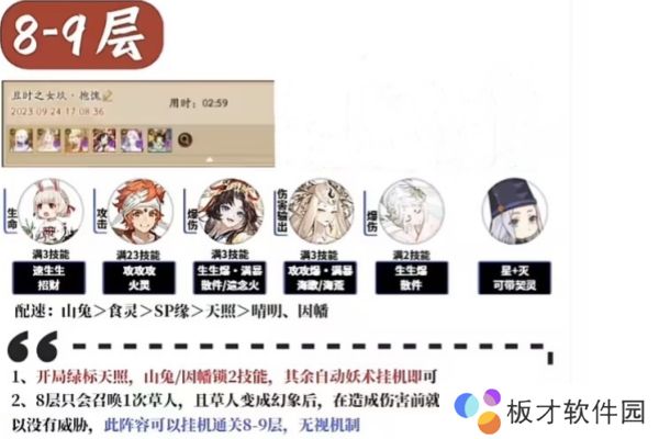 4、8-9层的阵容推荐,开局绿标天照,山兔、因幡锁技能,其余自动妖术挂机就行。