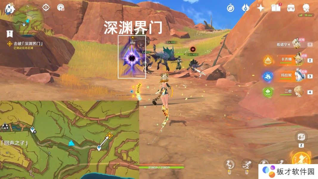 传送「回声之子」东方向锚点,往地图的东北方向走,击破「深渊界门」