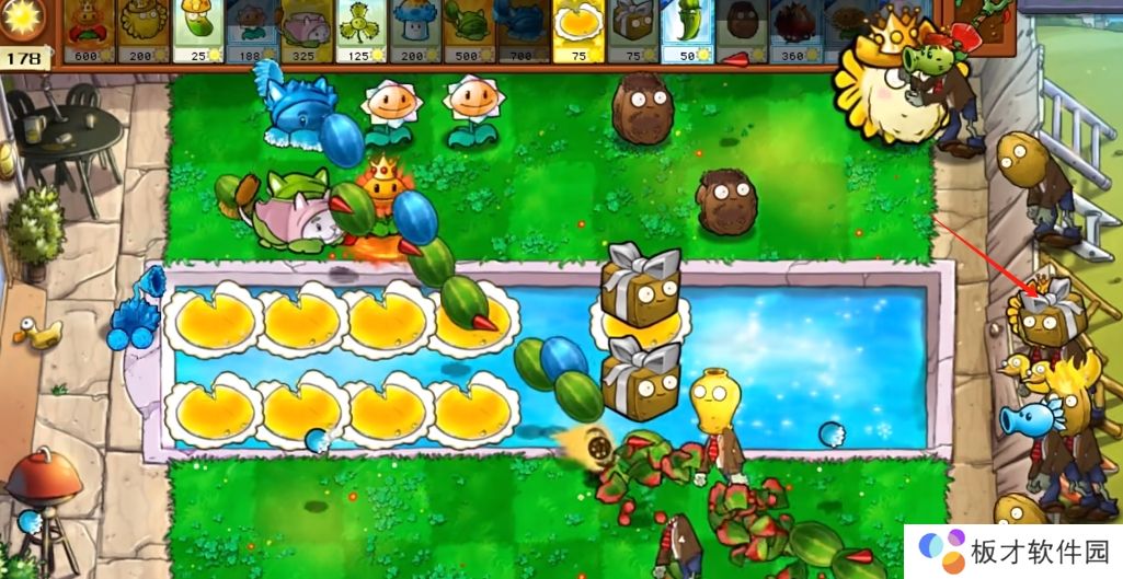 血量1000,向你三行最后一列的植物投掷玉米粒或黄油20%概率(定住植物3秒)
