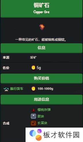 铜矿石可以放在熔炉中冶炼制作出铜锭。冶炼消耗5个铜矿石和1个煤炭,耗时30分钟(游戏内时间)。售价为60g。