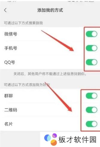 4、把所有的开启方式点开即可解除微信添加好友的限制。