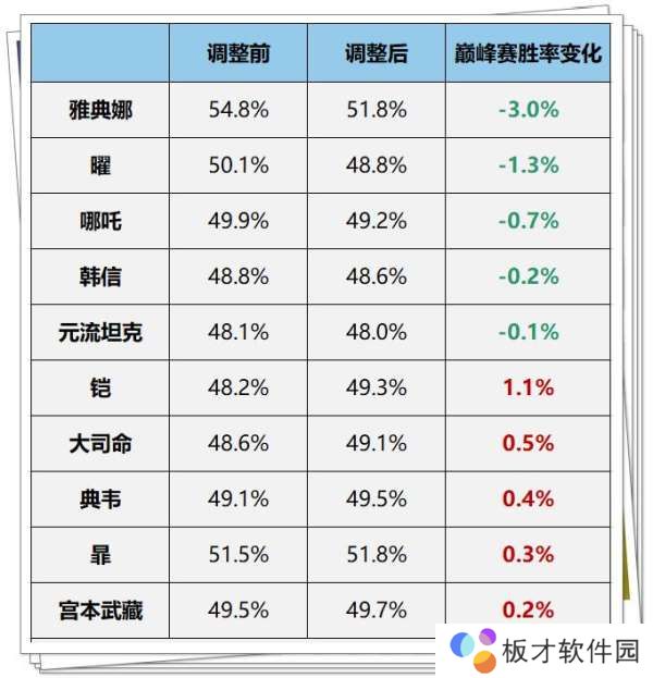 ①雅典娜胜率暴跌3%,曜胜率下跌1.3%,哪吒胜率下跌0.7%,整体强度下滑非常明显。