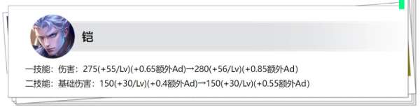 铠一技能上调5-10点伤害和0.2额外AD加成,二技能上调0.15额外AD加成,小幅加强了半肉铠的输出能力。