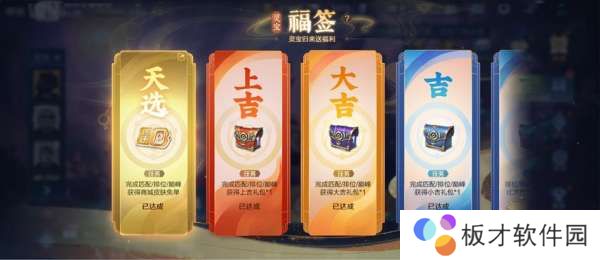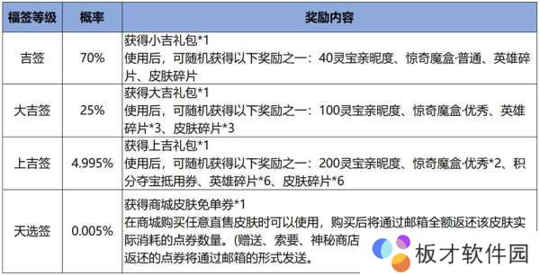 分为吉签、大吉签、上吉签和天选签四种,其中天选签可以获得商城皮肤免单券,全额返还1款皮肤的点券。