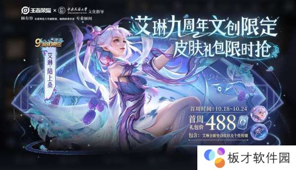 艾琳新皮肤-陌上桑,品质史诗、标签9周年限定,皮肤礼包10月18日~10月24日上架,488点券包含艾琳新皮肤+同款个性按键。