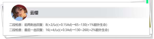 云缨二段枪意回血提升了基础数值和等级加成,Ad加成改为额外生命值加成,提升了云缨出肉装的收益。