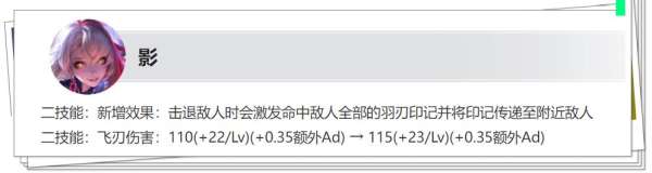 影普攻会给敌人叠加印记,每层印记提升二技能40-80+15%额外AD伤害,现在印记可以自动传递,对于影打团的伤害会有很大的提升。