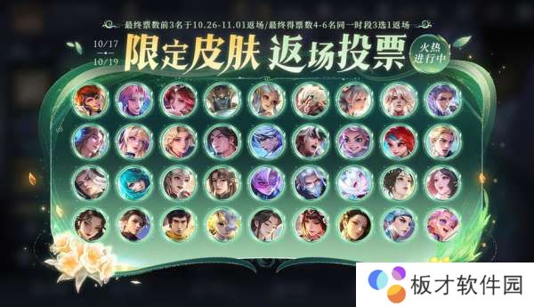 返场投票时间10月17日-10月19日,玩家每天最多可获得3张投票券,票数1-3名皮肤直售返场,票数4-6名的皮肤三选一购买。