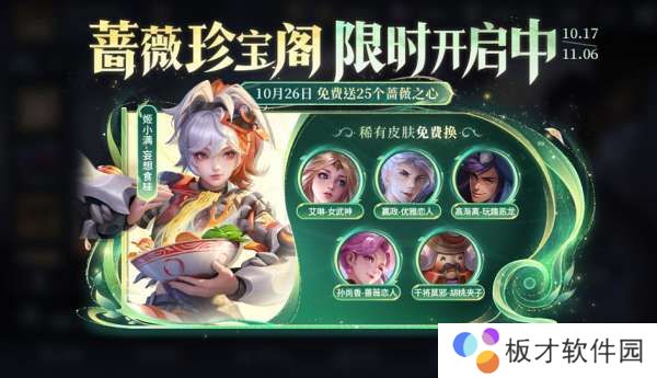 活动时间10月17日-11月06日,蔷薇珍宝阁限时开放,10月26日当天登陆可领取25个蔷薇之心。