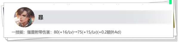 暃一技能强化普攻下调5-10点基础伤害,上调0.2额外AD加成,小幅提升了半肉/输出流玩法的伤害。