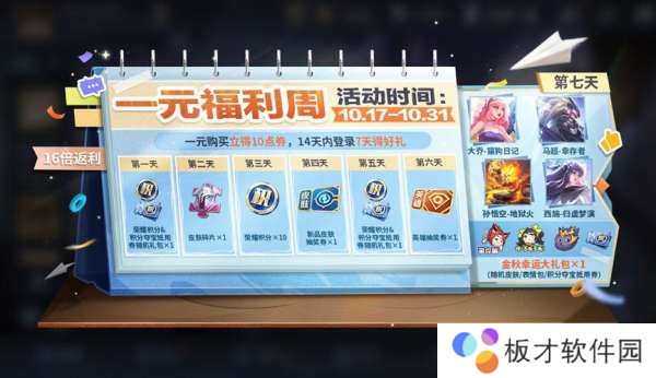 活动时间10月17日-10月31日,购买10点券开启7天登录好礼,可额外获得皮肤碎片、荣耀积分和积分夺宝券等奖励。