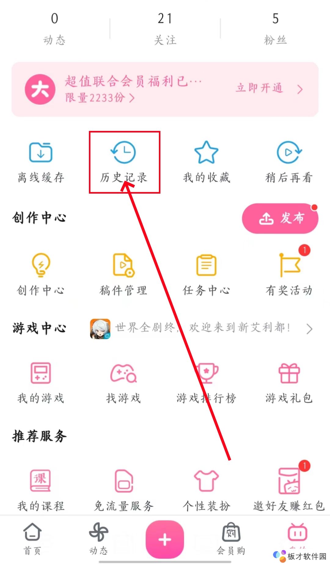 2、然后在我的页面点击上方的“历史记录”。