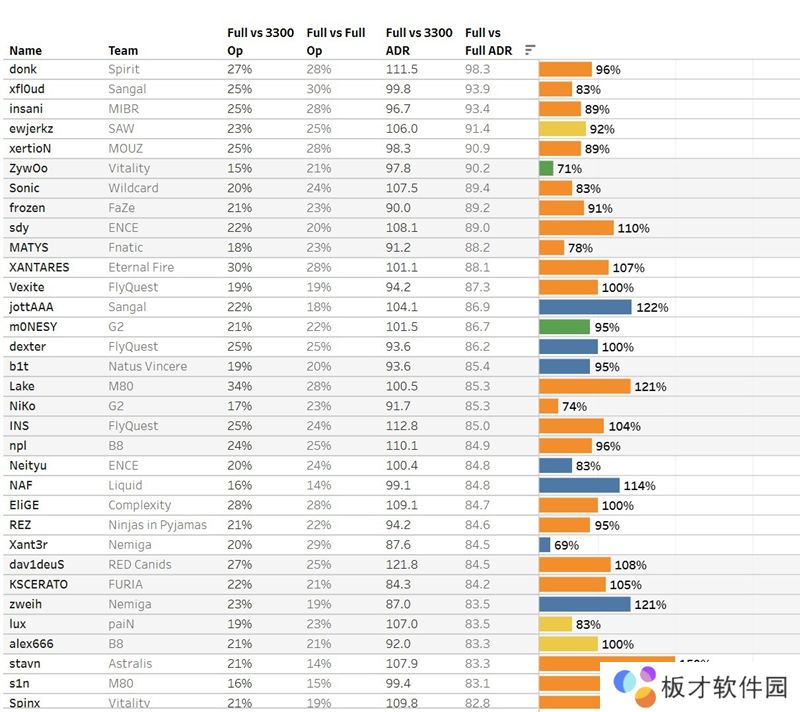 除了对阵全起敌人的ADR位列第一之外,donk在全起局的首杀数据上不遑多让。全起局他的首杀数据达到了28%,在榜单中的所有选手中位列第三名,仅低于xfl0ud和XANTARES。