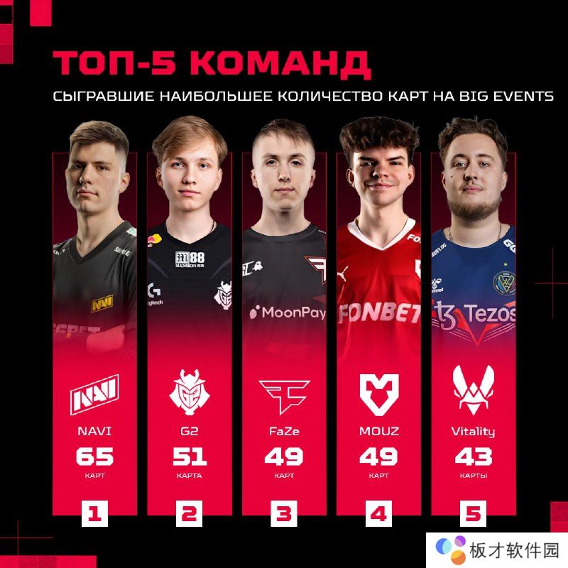 作为2024年迄今为止表现最稳定的战队,NAVI在今年国际大型赛事中总计打了65张地图,位居所有战队之首。排名第二的是